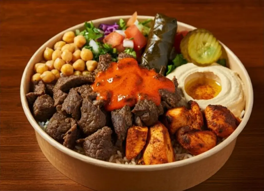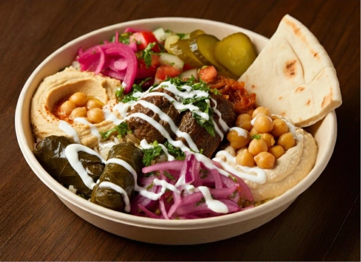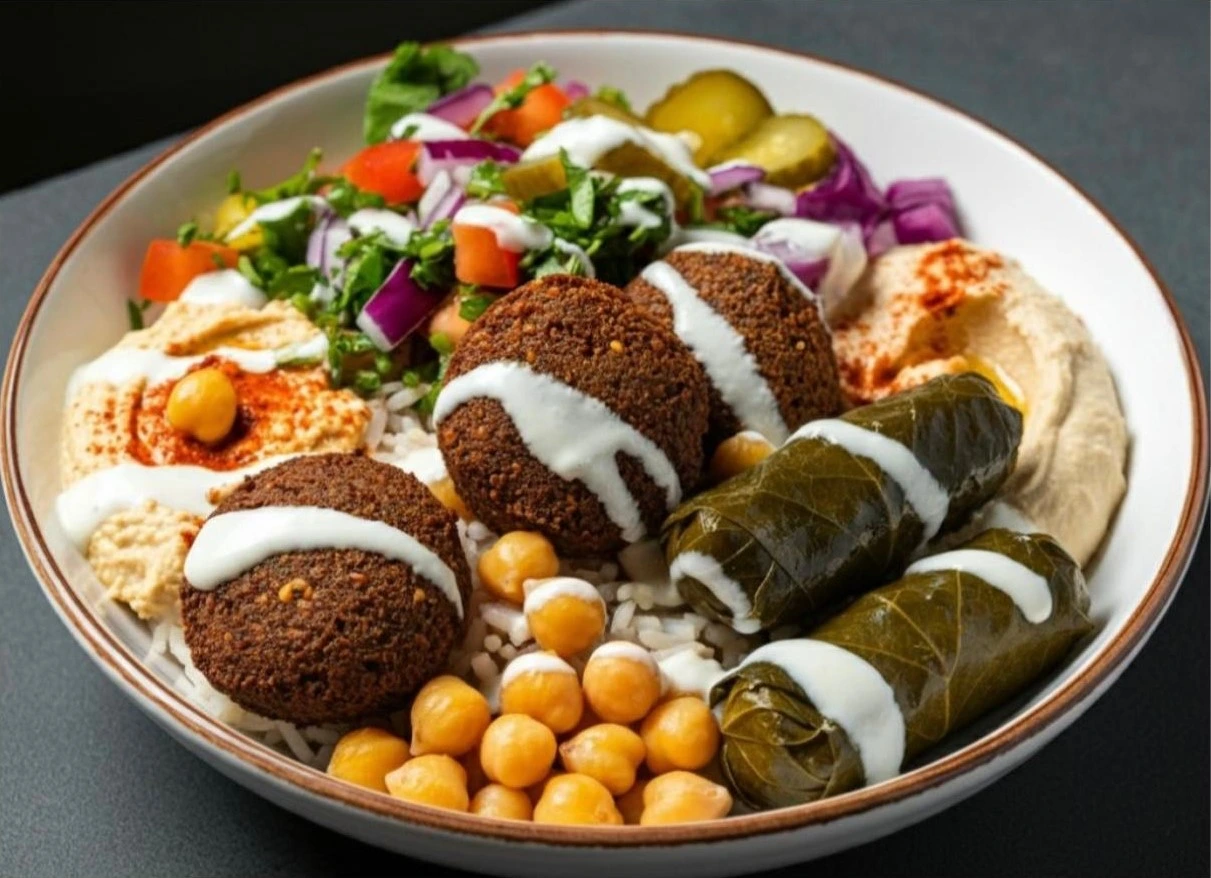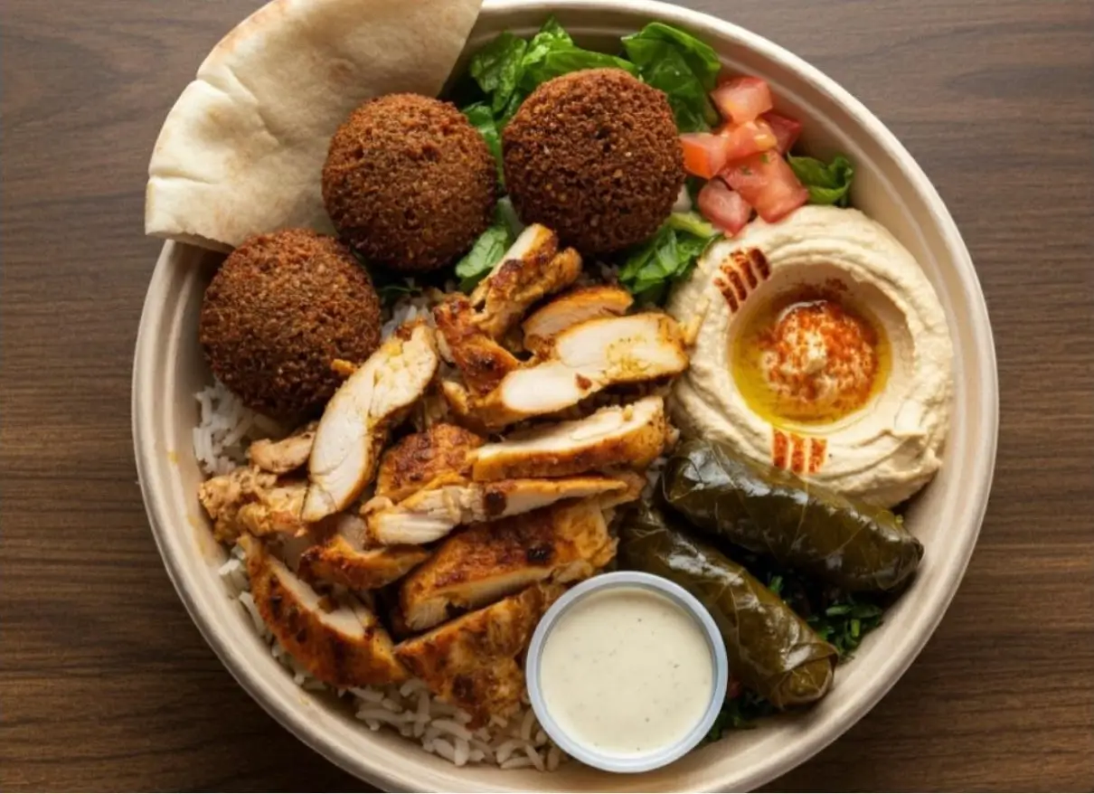 Chicken shawarma, Basmati Rice, Hummus, salad, pickles, Stuffed with grape leaves, garlic dressing, and Pita Bread.3- CHICKEN & FALAFEL = $ 12.99